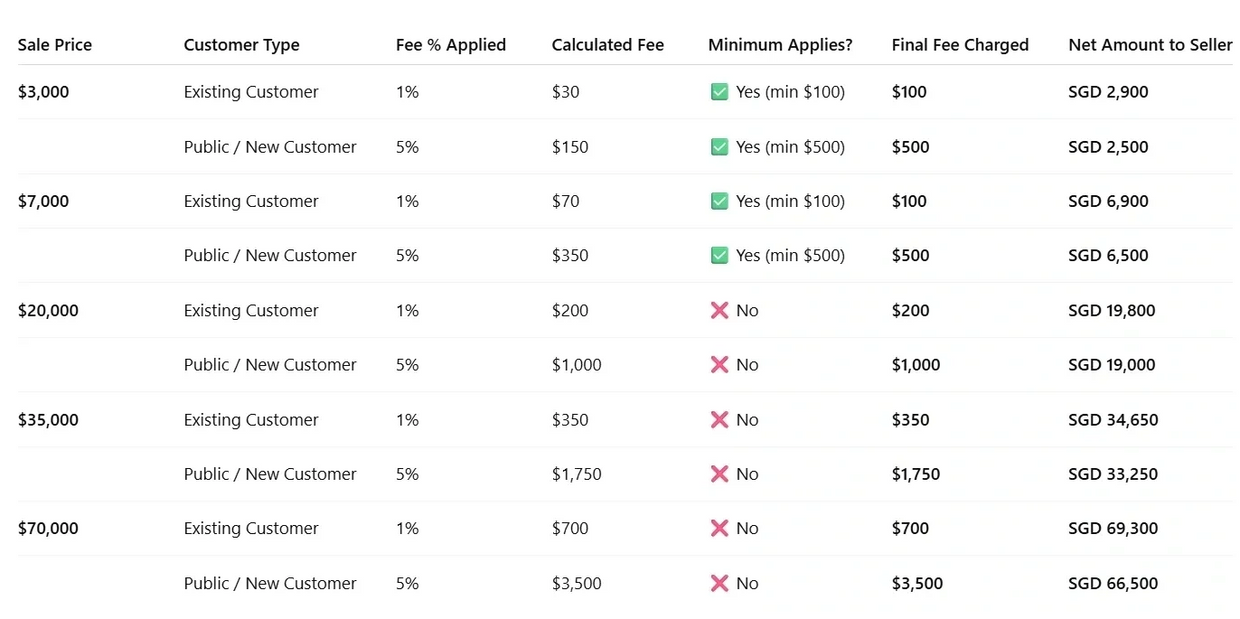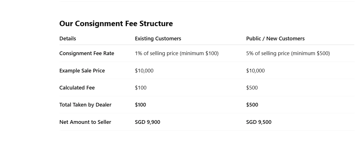 We offer a straightforward and seller-friendly consignment fee structure. Existing customers enjoy a low rate of just 1% of the selling price, with a minimum fee of $100. For public or new customers, the rate is 5% of the selling price, with a minimum fee of $500. There are no hidden charges