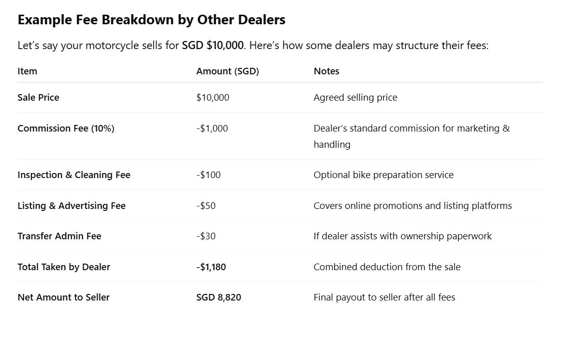 This is a typical fee structure used by some motorcycle dealers. In this example, the dealer charges a 10% commission on the selling price, along with additional service fees like inspection, advertising, and administrative costs. These add-ons can significantly reduce the final amount the seller receives.